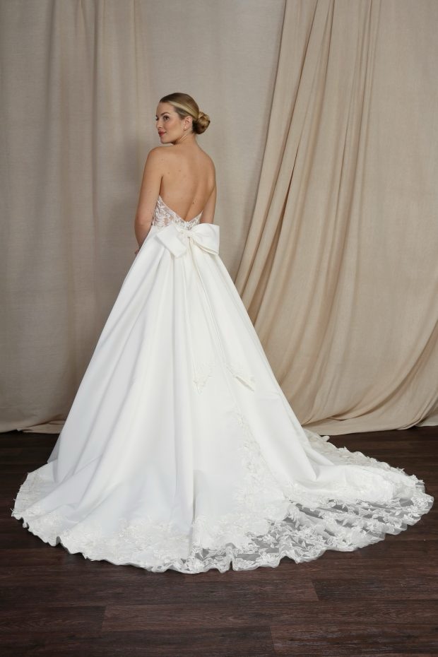 BL436 – Bow Back Strapless A-Line Ballgown: The whimsical full bow at the back of this gown adds a dramatic flair, offering a playful yet sophisticated touch.