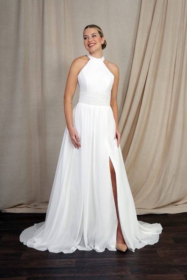 BL434 – Halter Neck Chiffon and Organza Dress: Featuring stylish halter necks and soft chiffon fabric, this gown highlights the shoulders and arms with elegant movement.