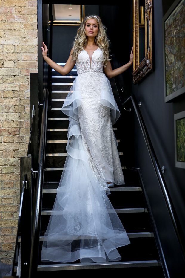 Zora – Fit and Flare Dress with Detachable Half Overskirt: Shimmer and sparkle all day and night with this incredible fit and flare dress, featuring a fully boned bodice and dramatic train, with a detachable half overskirt.