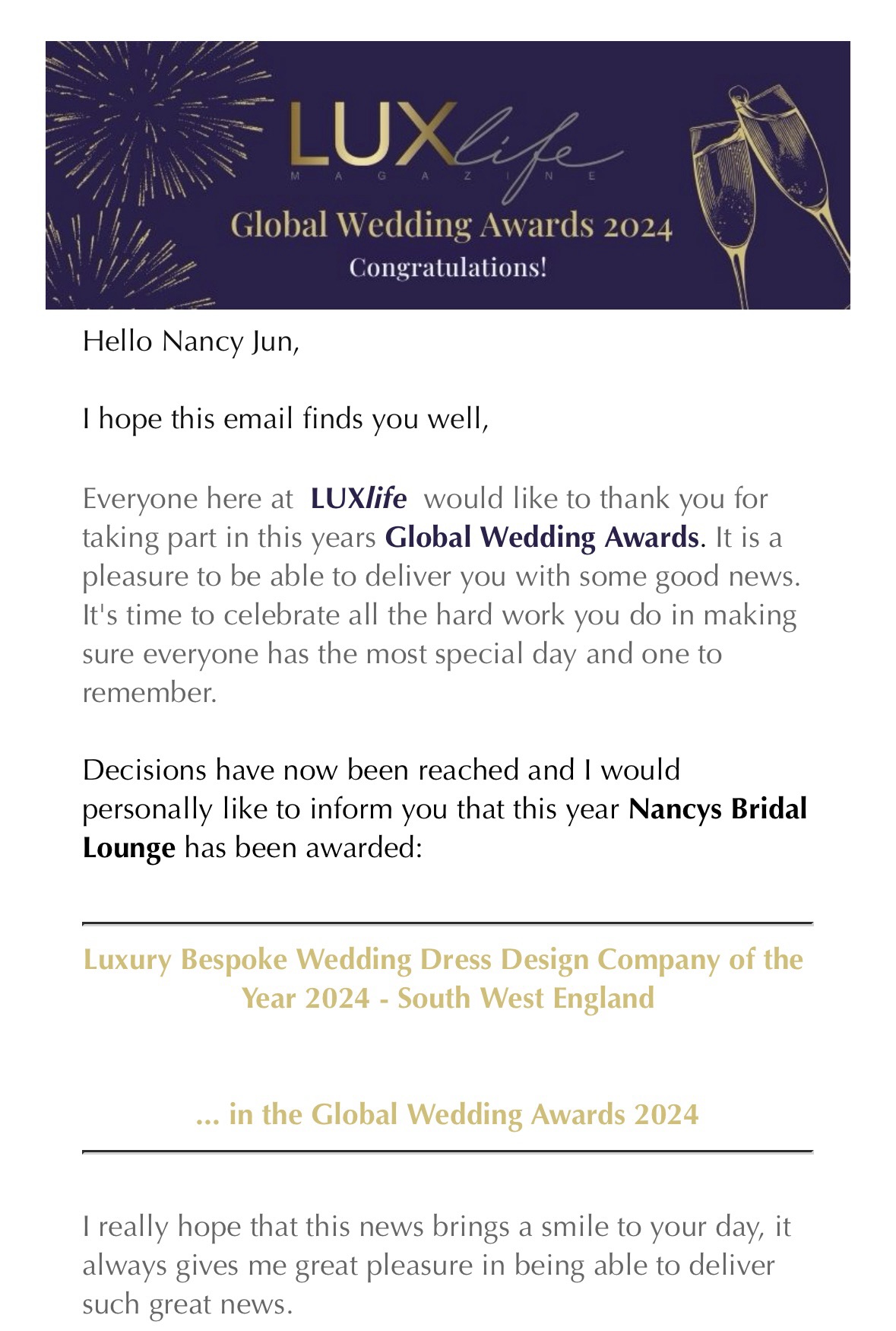 Great news! We have been awarded as Luxury Bespoke Wedding Dress Design Company of the Year 2024 – South West England in the Global Wedding Awards 2024. This recognition means the world to me!