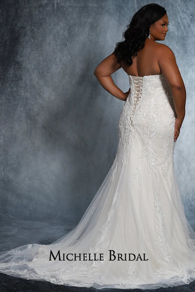 MB2305, this classic A-line design is updated with modern sparkly lace on the bodice and skirt. We love the stunning lace back feature, and the chapel train completes the polished look.