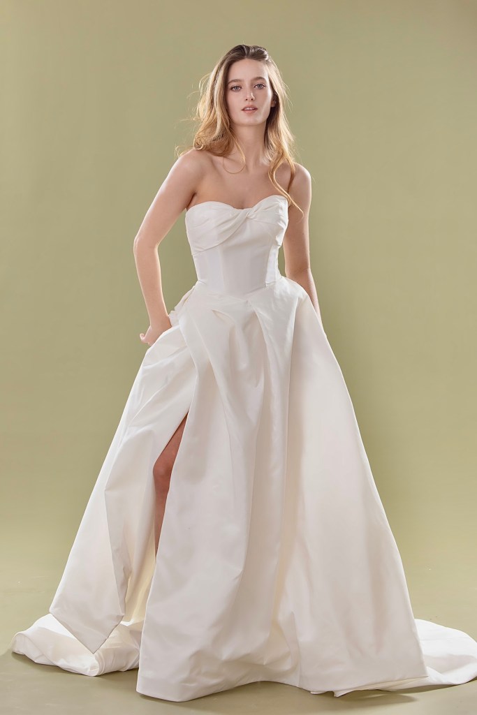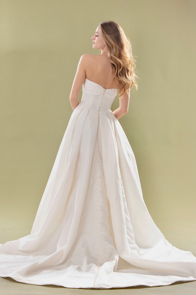 A stunningly simple ballgown style dress made from crisp satin for a striking, glamorous princess dress. The sweeping off shoulder sleeves give a flattering Bardot silhouette, with clever gathers in the satin bodice to define your shape. The cinched in waist leads to a full satin skirt with deep pleats for extra volume. Satin covered buttons are a feature on the back of the dress all the way to the end of the train to guide your eye down the length of the skirt. A truly classic design. It’s also available in 47 colours, making it perfect if you’re looking for a unique, colourful wedding dress!