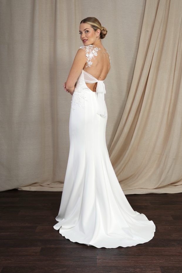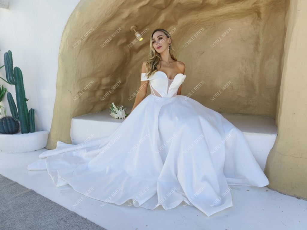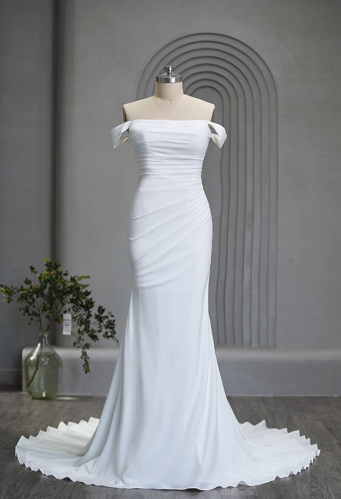 HW2975, Combining timeless elegance with vintage charm, this exquisite gown crafted from luxurious crepe fabric flatters every figure. Featuring off-the-shoulder straps and delicate buttons down the train, it’s perfect for any wedding setting, from traditional to rustic.