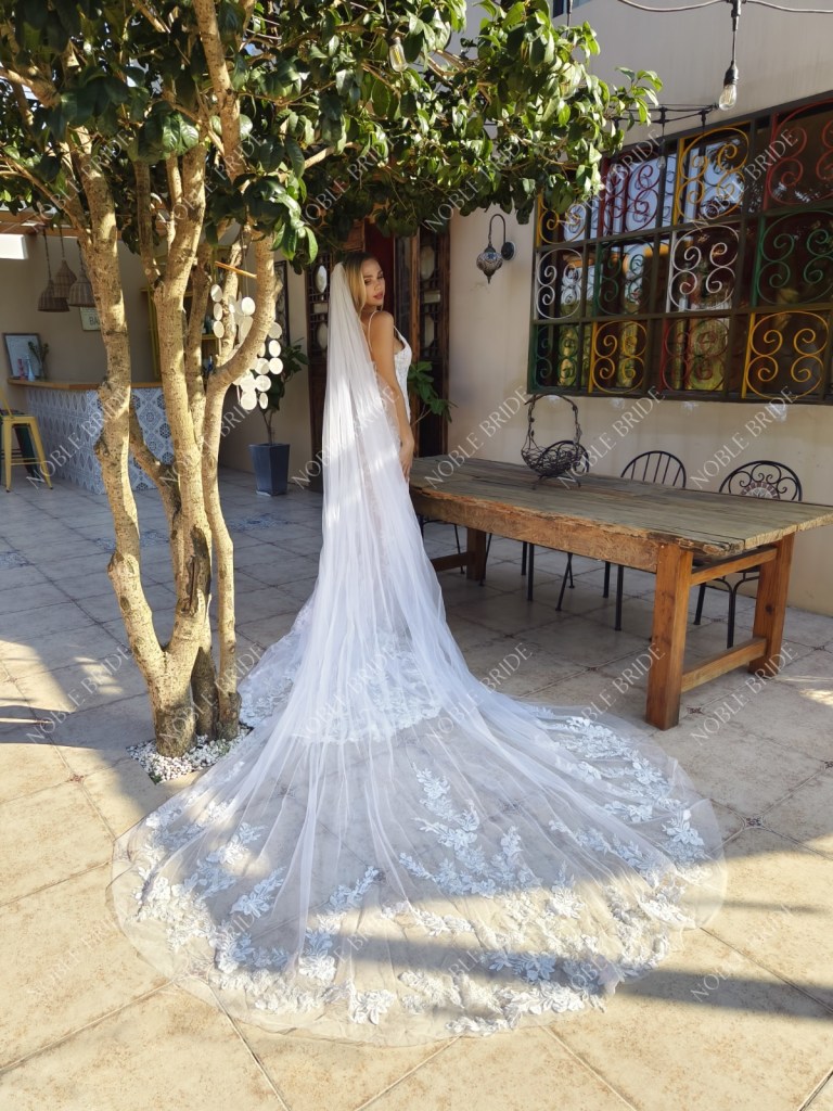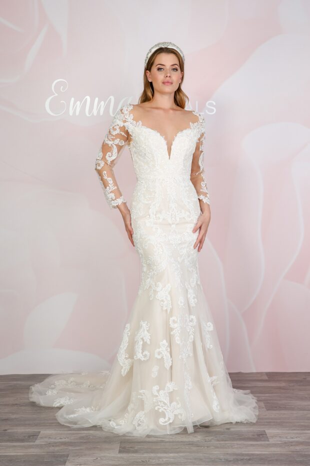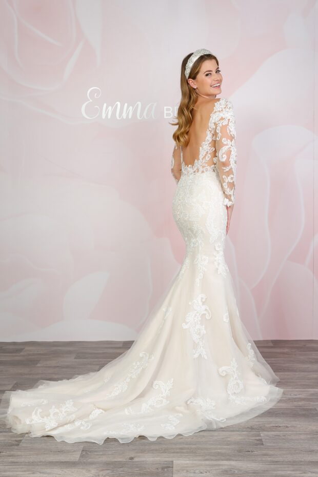 The lace long-sleeved dress of dreams! This classic style is covered with intricate lace appliques. The low scoop back with lace edge has such an elegant feel as the lace continues up to the shoulders and down the tulle sleeves. A nude illusion neckline ensures that the sleeves stay in place on your shoulders while the plunge neckline sculpts the upper body. The fit and flare skirt hugs the hips and flares out at the knee creating a gorgeous silhouette.