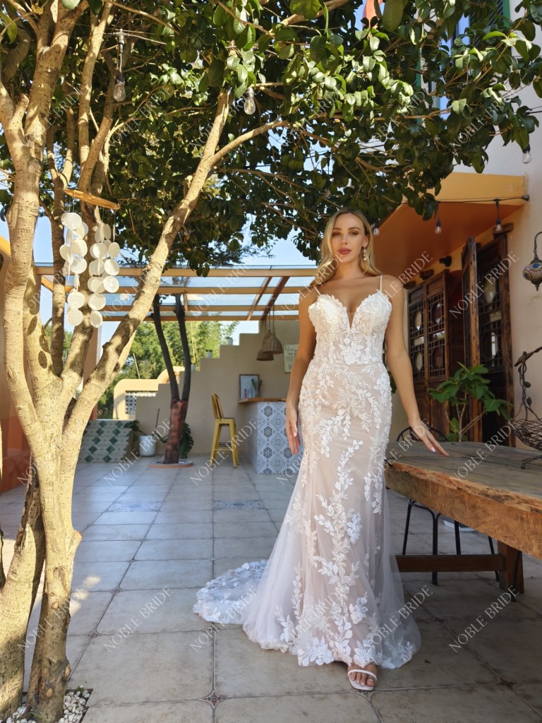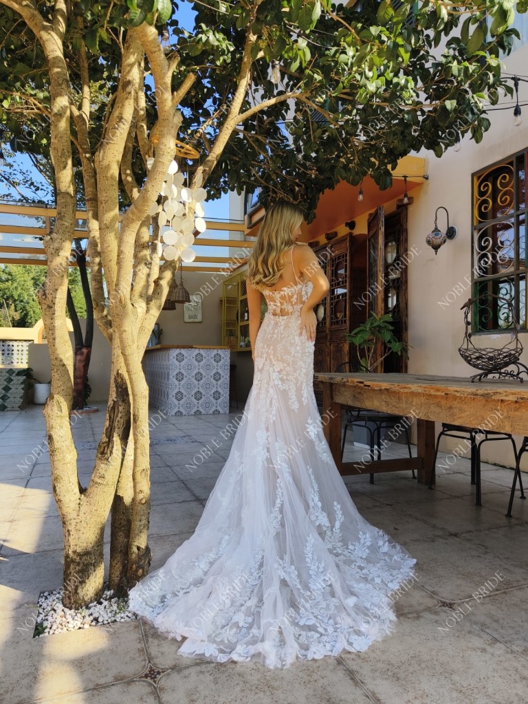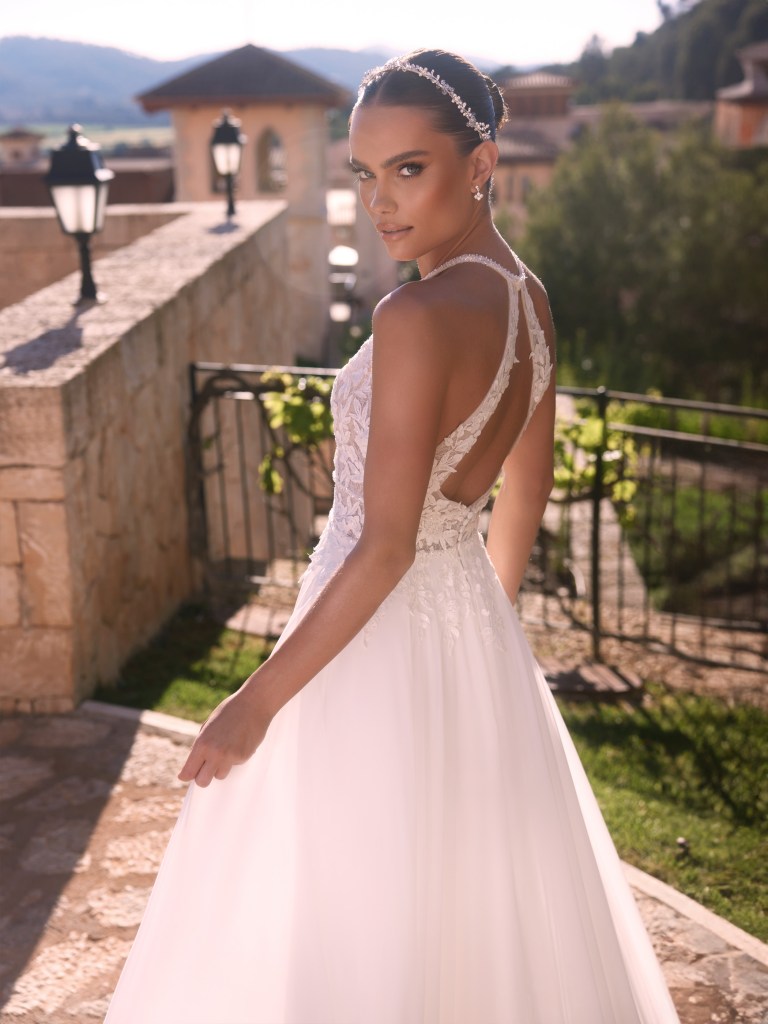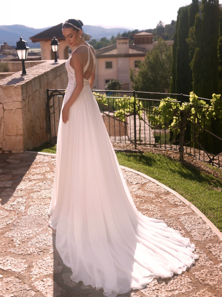 Elegance in simplicity defines this stunning wedding dress Adelina. Crafted from the fine crepe, its flattering A-line silhouette is complemented by a graceful v-neckline and a chic v-back. For added allure, opt for the optional floating overskirt, bringing a touch of drama and ensuring you make a statement on your unforgettable day.