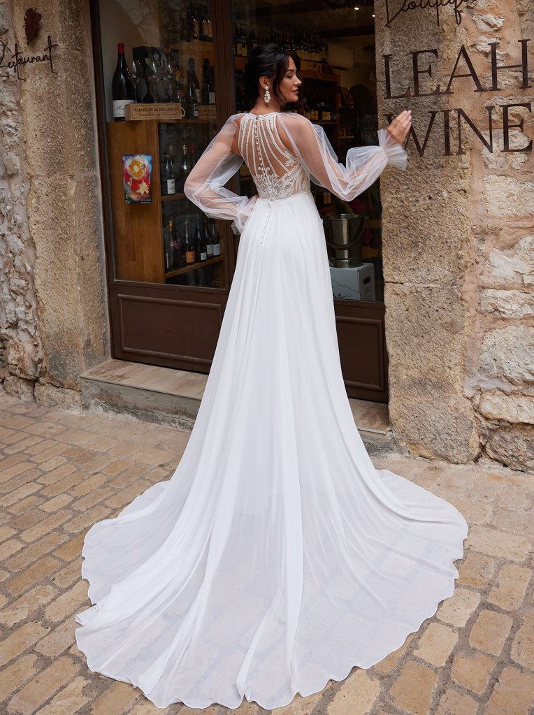 Allow us to introduce you to this stunning straight-cut dress, featuring lace and sheer tulle on the bodice, a bateau neckline, and long sleeves that add texture and dimension to the classic silhouette. The figure-flattering bodice and chiffon skirt with a high side slit and train complete the most unforgettable look for your wedding day.